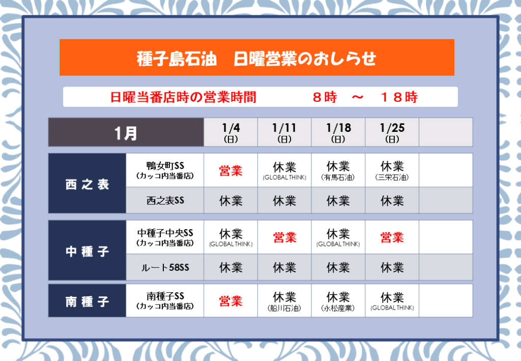 令和8年1月 ガソリンスタンド日曜営業当番店のお知らせ 2025年12月25日2025年12月17日 tanesekixeditor02 いつも種子島石油の各SSをご愛顧いただき、誠にありがとうございます。令和8年1月のガソリンスタンド日曜当番店のスケジュールをお知らせいたします。ご確認いただき、お間違えの無いようにご来店ください。※当番店の営業時間は、8時から18時となります。※お盆時期、年末年始(西之表市はGWも)については各販売店ごとの営業となり、当番店ではございません。今後とも種子島石油のSSをどうぞよろしくお願い致します!