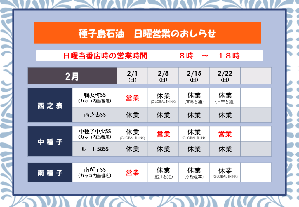 令和8年2月 ガソリンスタンド日曜営業当番店のお知らせ 2026年01月23日2026年01月17日 tanesekixeditor02 いつも種子島石油の各SSをご愛顧いただき、誠にありがとうございます。令和8年2月のガソリンスタンド日曜当番店のスケジュールをお知らせいたします。ご確認いただき、お間違えの無いようにご来店ください。※当番店の営業時間は、8時から18時となります。※お盆時期、年末年始(西之表市はGWも)については各販売店ごとの営業となり、当番店ではございません。今後とも種子島石油のSSをどうぞよろしくお願い致します!