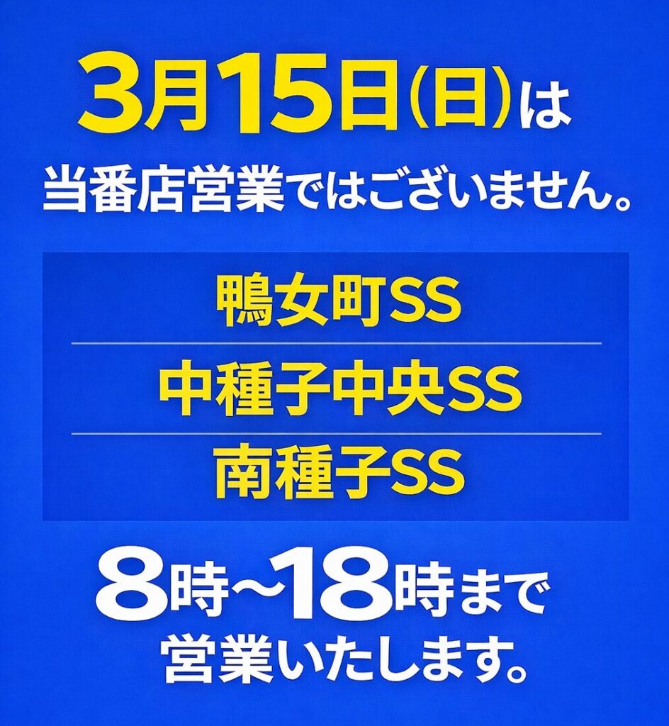 3月15日(日)当番店営業について 2026年03月13日2026年03月13日 tanesekixeditor02 いつも当店をご利用いただき、誠にありがとうございます。 本来、3月15日(日)は当番店営業の日ですが、燃料油の大幅値上げに伴う混雑緩和のため、この日は各販売店ごとの営業となります。 当社では下記SSを8時~18時まで営業いたします。 ・鴨女町SS・中種子中央SS・南種子SS 混雑が予想されますので、お時間に余裕をもってお越しください。皆さまのご来店をお待ちしております。
